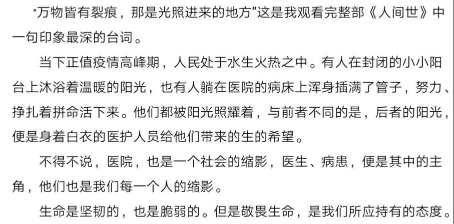 为进一步加强女生学习观教育,学院旗帜鲜明地向女生发出学习倡议,倡导其积极自学,精读优秀书籍,观看经典影视。“万物皆有裂痕,那是光照进来的地方。”1909班的蔡越同学这样写道,疫情期间的“逆行”,尤其闪耀着生死之间人性的光芒,逆行者似一个个点灯之人;灾难带来伤痛,也带来力量,1706班的费越同学在观看《南京,南京》这部经典影片后,既回顾思考了历史之痛、百年之辱,又联系时事肯定中国人团结、不屈、奉献的精神,对疫情抱有乐观积极的态度;个人与国家,永远紧密联系,1806班的艾永懿和教科1905班的施明慧,都重温了一遍《我和我的祖国》。在他们文中,无论钟南山院士这样的杰出人物,还是广袤土地上的普通民众,都是祖国前进不可或缺的部分。