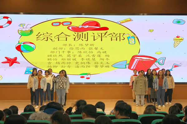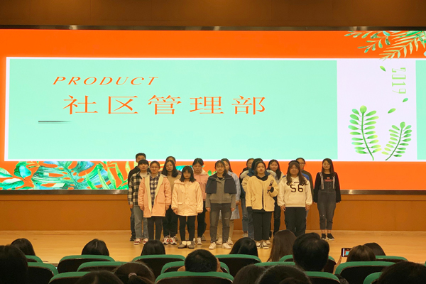 各部门精心组织准备了节目和本部门自我介绍。秘书部的诗朗诵《只要明天还在》,声情并茂,感人至深;学风部干事们带来的《晴天》,综测干事们的《遇见》,早操部的《无名之辈》和社区管理部干事们带来的《世间美好与你环环相扣》,清新的歌声展示了干事们的活力与朝气。精彩的表演过后,主持人刘洁雯和孙佳艺组织了一场中场互动游戏,游戏中干事们充分发挥了集体智慧,明白了团队合作的重要性,也为严肃的会议现场增添了趣味性。夏晶莹张悦和相一帆分享了学习和工作上的经验,并嘱咐干事们在做好自己本职工作的同时也不要忘了学生的本职身份。戴欢和褚心怡与大家分享了责任、态度和激情在工作中的重要性。新干事代表朱雨蝶则表达了自己在自管会大家庭中与大家相互学习相互进步的愿望。
