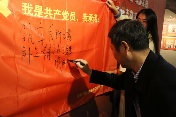 图为教科院教师党员写承诺。记者 干爽
