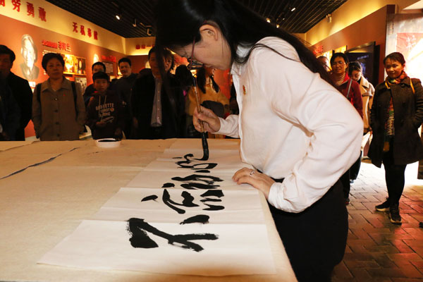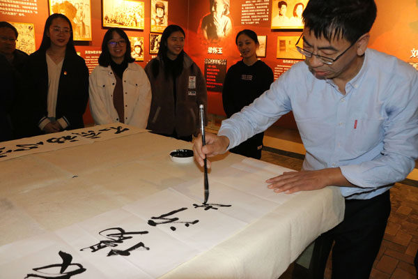 图为何杰用毛笔书写“弘扬沂蒙红嫂精神”。记者 干爽