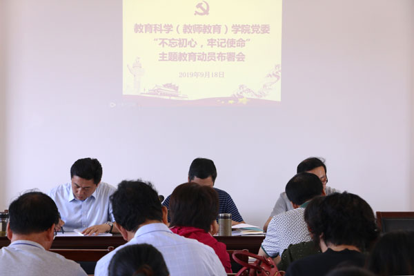 教科网9月19日电(记者 薛玉珏)为贯彻落实中央、省委以及学校党委关于开展“不忘初心、牢记使命”主题教育的指导思想和相关文件要求,教育科学(教师教育)学院于9月18日在1号楼503召开主题教育工作动员布置会。会议由学院党委副书记滕祥主持,教育科学(教师教育)学院党委领导班子、党办、校办副主任周鹏及学院全体师生党员参加会议。