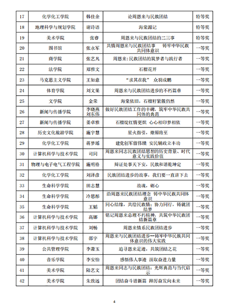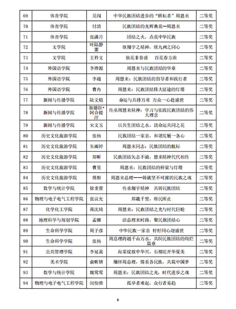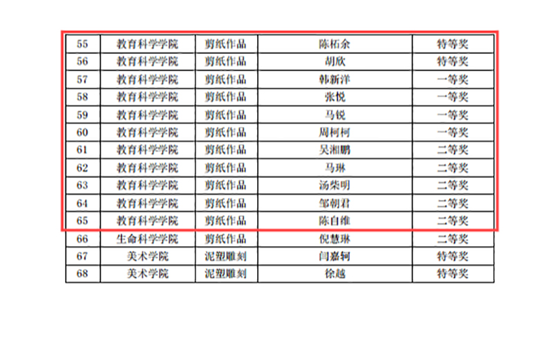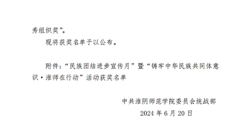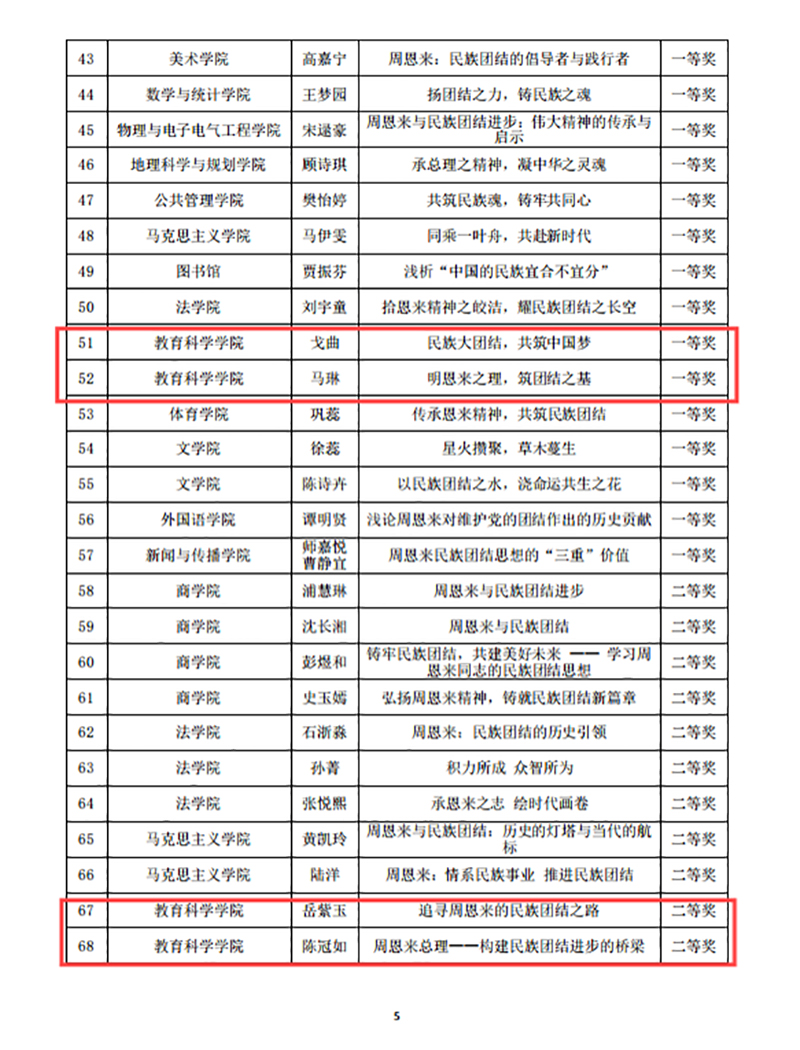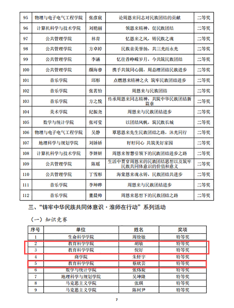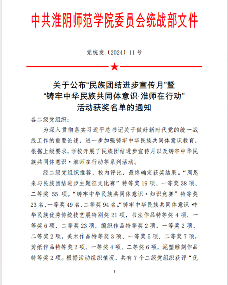 教科院积极组织师生参加了“周恩来与民族团结进步主题征文比赛”“铸牢中华民族共同体意识·淮师在行动”知识竞赛及“铸牢中华民族共同体意识·中华民族优秀传统技艺展作品评比”等赛事,并取得了优异成绩。在征文比赛中,教科院荣获特等奖一项、一等奖两项、二等奖两项;在知识竞赛中,教科院获特等奖三项、一等奖三项、二等奖五项;在民族优秀传统技艺展作品评比中,教科院的剪纸作品荣获特等奖两项、一等奖四项、二等奖五项。