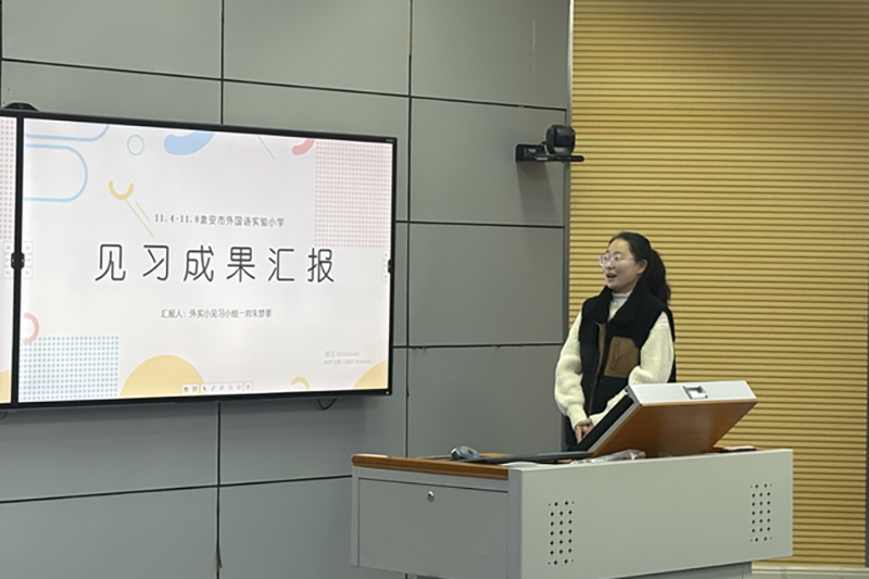 随后,刘朱梦菲同学代表第二小组汇报了他们在淮安市外国语实验小学的见习成果。她特别提到,小组成员有幸以志愿者的身份参与了江苏省小学心理健康教育基本功大赛,近距离感受了一批一线优秀教师的教学风采。这段经历让他们对心理健康教育有了更深的理解,也激发了他们追求专业进步的热情。