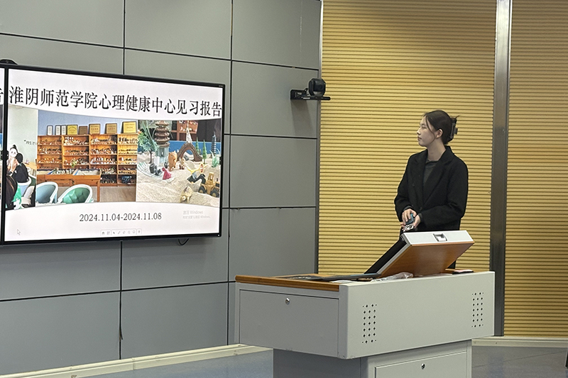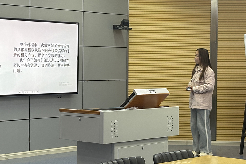 最后,江海琦和李思仪同学共同汇报了他们在淮师心理健康中心的见习成果。两位同学着重介绍了组织开放日活动的经历。他们亲自接待学校学生,带领大家体验了沙盘、卡牌等心理活动,收获了宝贵的实践经验。开放日活动既锻炼了他们的实践能力,也加深了他们对心理学应用的认识。