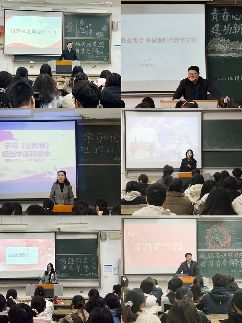 各班级围绕不同主题,通过知识问答、技能展示、朗读表演、理论宣讲等多种形式开展丰富多彩的活动。2301班以“梦绘未来,课启新程”为主题,通过学习展示、心态分享与未来展望,全面展现了学生们的学习状态和精神风貌;2302班开展“砥砺奋进强国路,谱写青春新华章”主题团日活动,学生们更加深入了解中国在时代更迭中谱写出的辉煌华章;2303班围绕“倚强国宏光,照青年华章”开展活动,呈现了中国的奋进历程与卓越成就,加深了同学们对青春力量与强国使命的深刻感悟;2304班开展“青春砥砺强国路,扬帆谱写新华章”团日活动,活动通过主题演讲、重温誓词、故事分享等环节,同学们表示要将个人理想融入国家发展大局;2305班开展“春风播清音,筑梦无声界”主题活动,学生通过情景剧表演、手工制作表演等形式带来一场沉浸式的师德教育洗礼;2206、2207班共同开展“学习《论教育》,担当学前新使命”主题团日活动,通过团课宣讲解读习近平总书记《论教育》的核心思想,深刻理解教育对“小我”和“大我”的价值和意义。