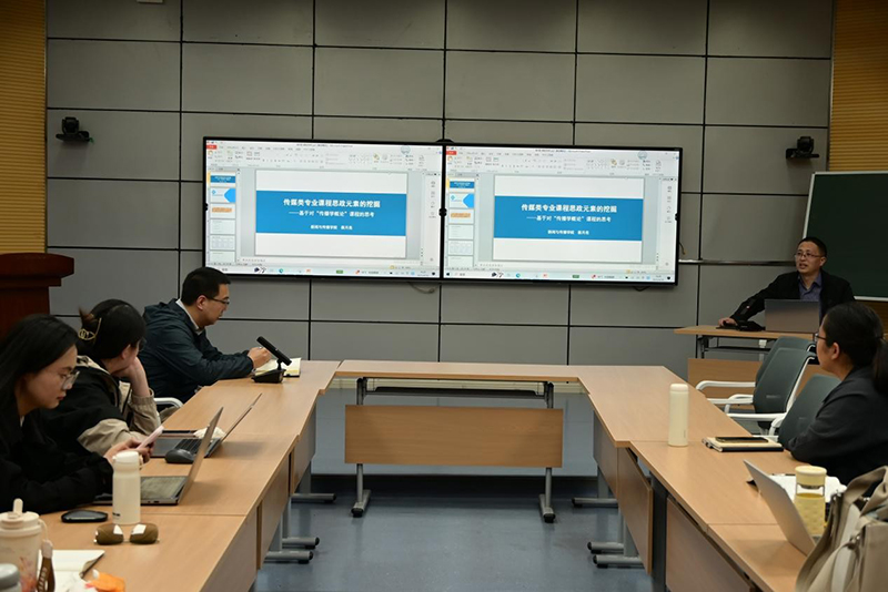 教科网4月17日电(记者 刘靖鑫 赵思晗)4月16日下午,教育科学学院、新闻与传播学院在2号楼智慧教室联合举办了主题为“专业课程思政元素的挖掘与融入”的教学研讨活动。本次活动由教科院副院长杨绪辉主持,主讲嘉宾为蔡月亮老师和申小春老师,两个学院的青年骨干教师参加了本次活动。