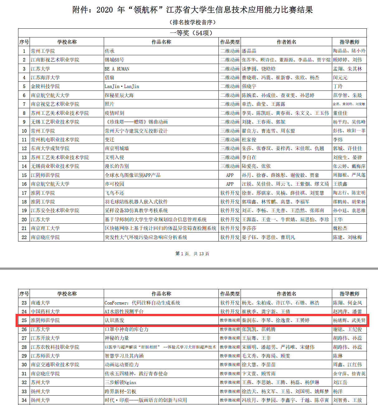 据悉,本次比赛由江苏省高等学校教育技术研究会主办,经过校赛选拔后,全省共收到117所院校申报的1068项作品,其中普通本科院校574项,高职高专院校494项,作品类型涉及二维动画、三维动画、APP、软件开发、教学微视频、微电影共6大类别。经专家分组评议,共评选出获奖作品323项,其中一等奖54项,二等奖108项,三等奖161项。