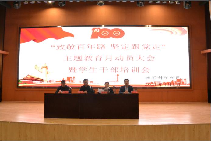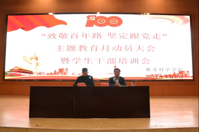 教科网4月9日电(记者 吴雪纯 肖箫 武美贤48日晚,教育科学学院于崇文楼106报告厅召开“致敬百年路 坚定跟党走”主题教育月动员大会暨学生干部培训会。会议由学院党委副书记滕祥主持,教科院院长曹如军、副院长任红娟、关工委常务副主任邓如陵、全体辅导员及教科院全体学生干部参加了会议。