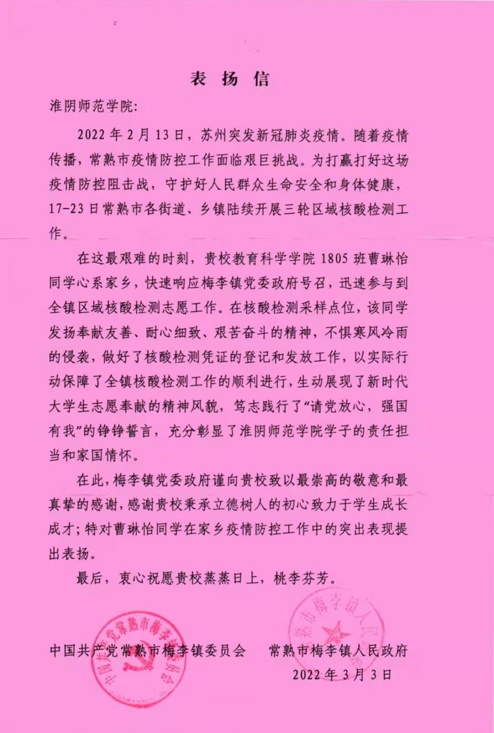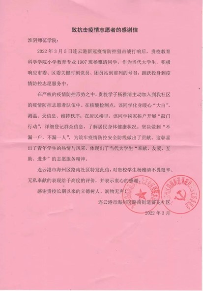 封封感谢信,浓浓抗疫情——致淮师教科学子的感谢信