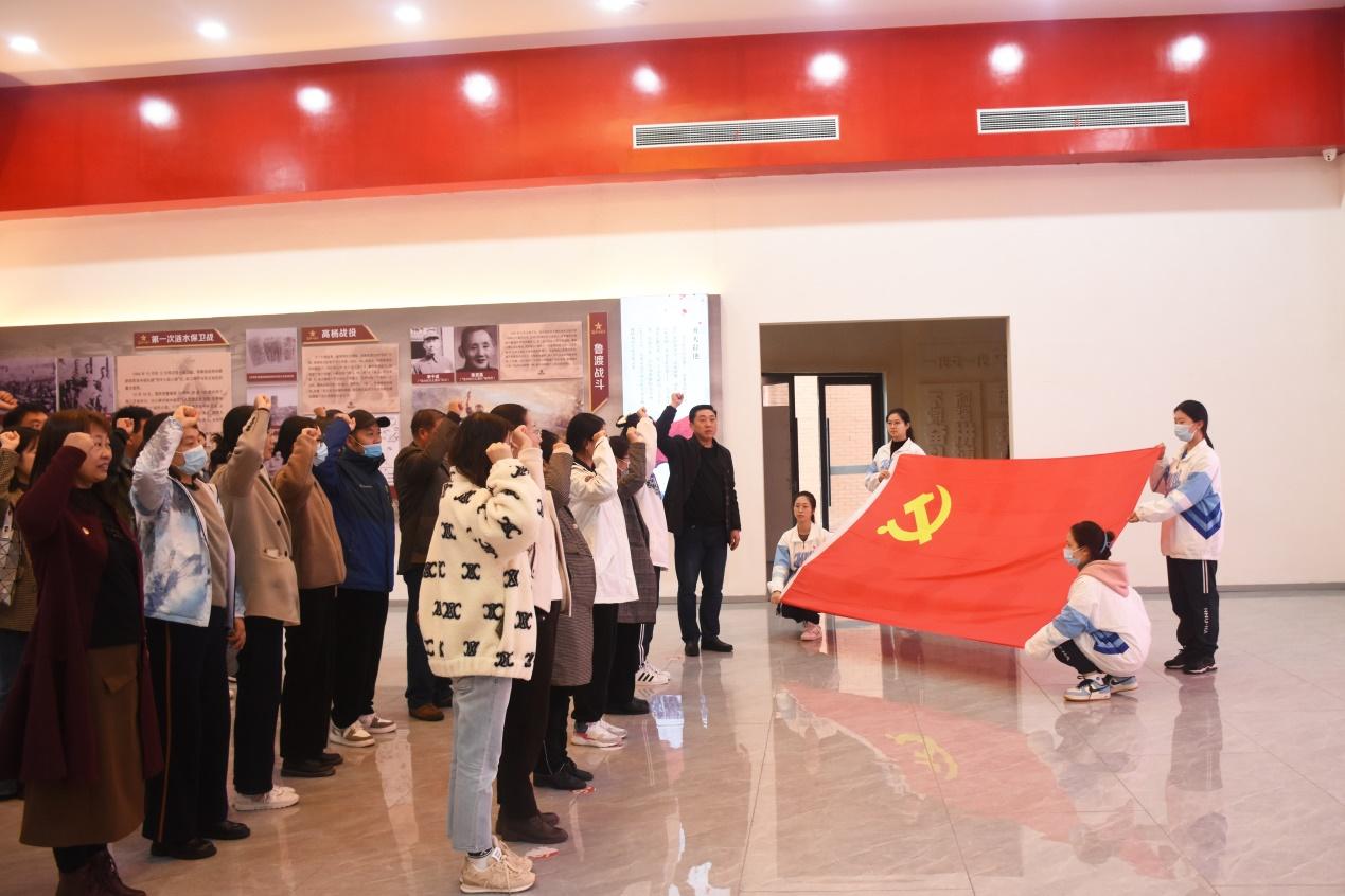 走进纪念馆,大家观看了馆内陈列的实物和图片,瞻仰了英雄形象,回顾了英雄事迹。沿着历史脉络,了解了“淮河大队”的成立、涟水党组织的发展及苏北抗日根据地的开辟历程,特别是讲解员深情并茂的谈到“涟水抗日第一枪”、“朱氏三杰”等红色故事,让在场的所有党员重温了那段艰苦而光荣的奋斗历程,感受了共产党人与人民群众的鱼水情深,领略了先烈们艰苦卓绝、不畏牺牲的革命精神,激发了大家同心同德、砥砺奋进的昂扬斗志。在滕祥同志的带领下,大家庄严地举起右拳,重温入党誓词,追忆入党初心,坚定理想信念。