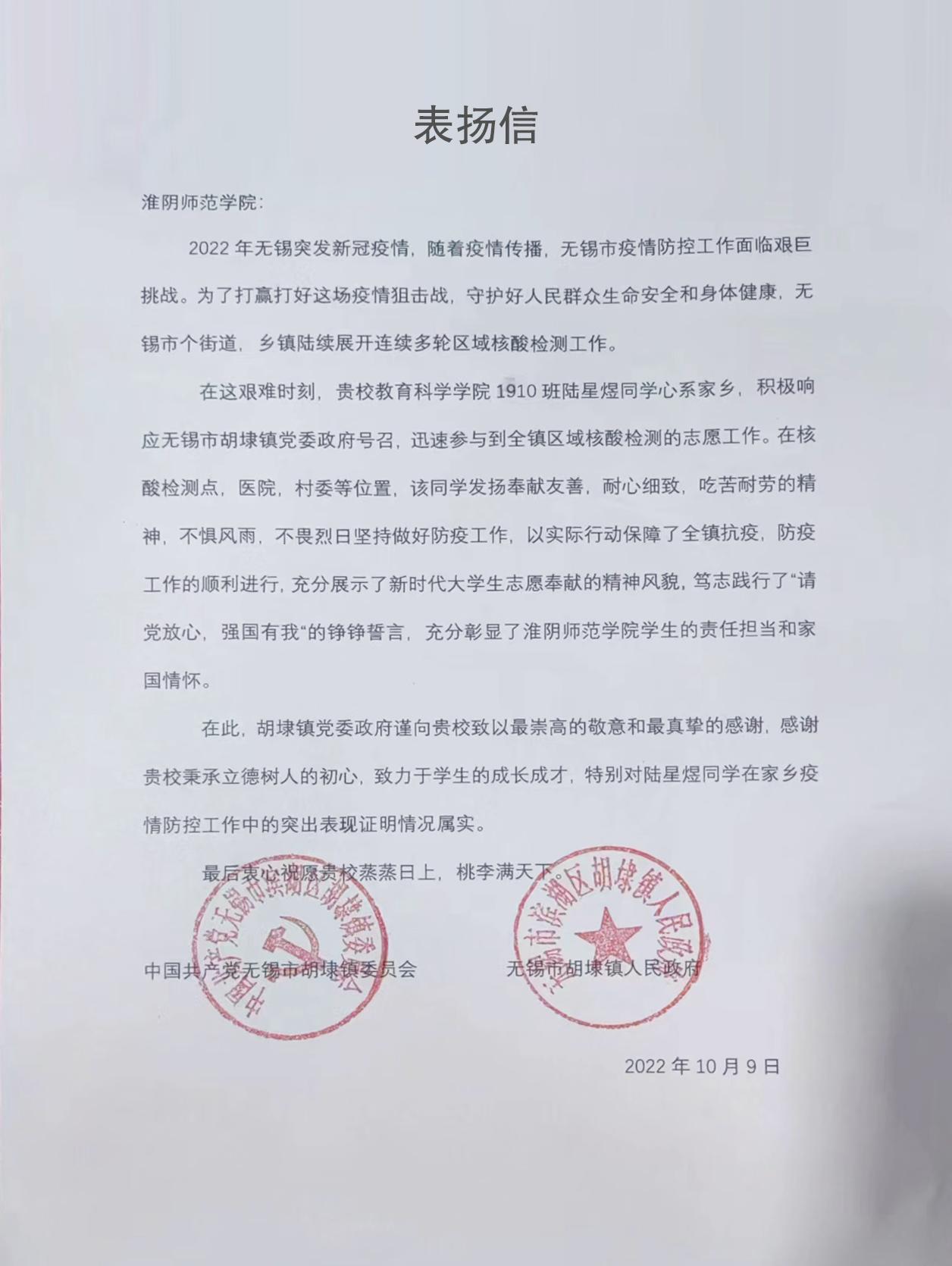 教科网10月15日电(记者 武美贤)近日,royal皇家88平台收到无锡市胡埭镇人民政府送来的感谢信,对教育科学学院1910班陆星煜同学在家乡抗击新冠疫情期间无私奉献的精神表示由衷的赞许与感谢。