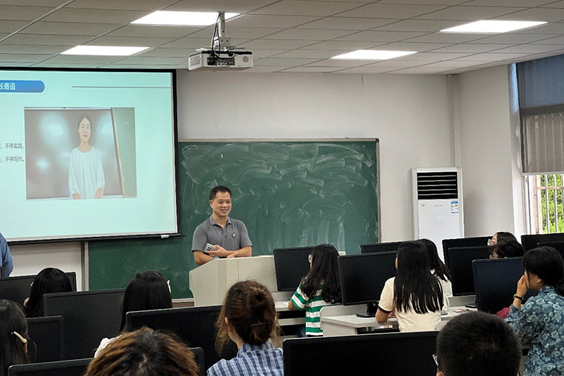 首先是教育技术学系党支部书记封昌权老师发言。封老师从三个方面谈了一些自己的建议:进入大学后如何独立自主安排好自己的学习;如何合理使用好电子设备;如何和同学互助合作。