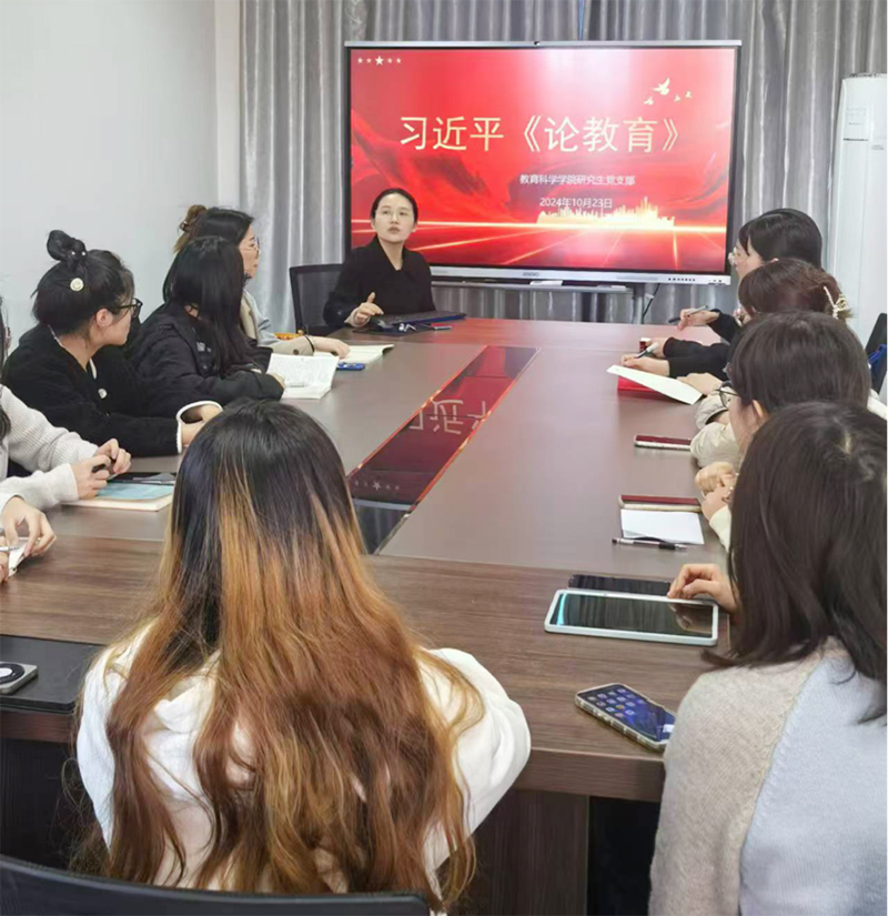 教科网10月23日电(记者 孟茹)为进一步加强学风建设,深入思想政治教育,教科院研究生党支部于10月23日下午15:30在1号教学楼409会议室开展习近平《论教育》主题党课。本次党课由研究生党支部书记梅雪主讲,党支部全体党员及积极分子参加。