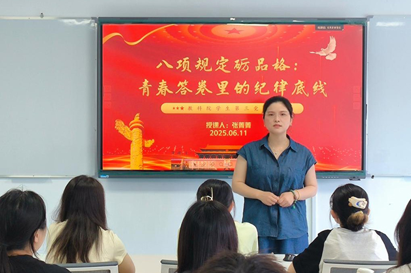 教科网6月12日电(记者 倪好)为深入学习贯彻习近平总书记关于加强党的作风建设的重要论述,强化学生党员的纪律意识和党性修养,教科院学生第三党支部于6月11日10点30分在教科楼1-402开展一场主题为“八项规定砺品格:青春答卷里的纪律底线”的专题党课。本节党课由党支部书记张菁菁主讲,党支部全体党员参加。