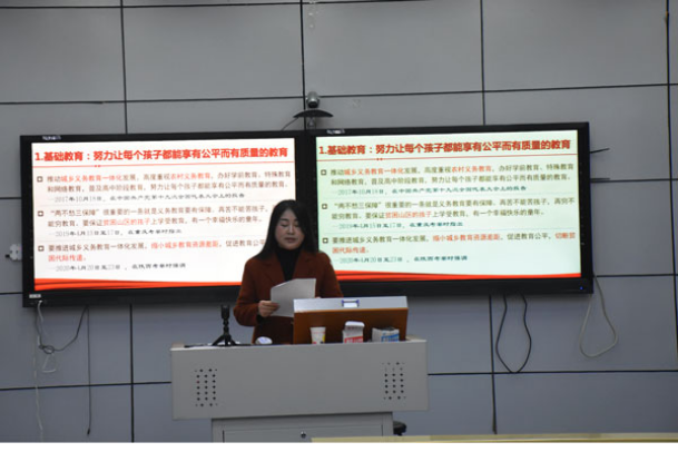 教科院副院长任红娟和文科教学论教研室党支部书记潘友梅,分别以“深入学习贯彻习近平总书记关于教育工作的重要论述 努力推动学院工作更上一个新的台阶”、“从习近平总书记的重要论述领悟中国共产党关于教育的初心使命”为主题进行领学。