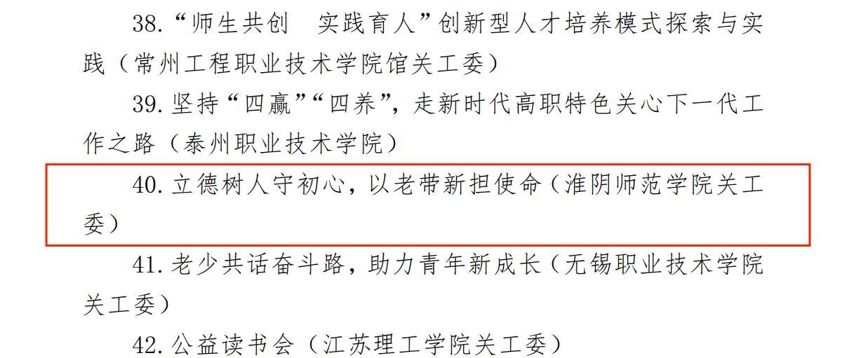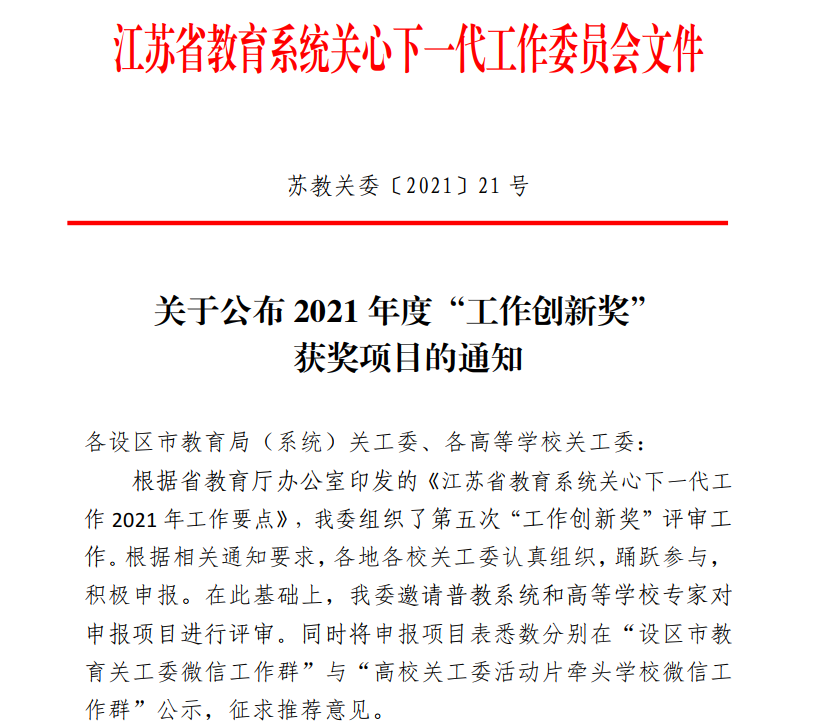 教科网11月26日电(记者 武美贤)近日,江苏省教育系统关心下一代工作委员会发布《关于公布2021年度“工作创新奖”获奖项目的通知》,royal皇家88平台教育科学学院关工委报送的“立德树人守初心,以老带新担使命”项目荣获二等奖。
