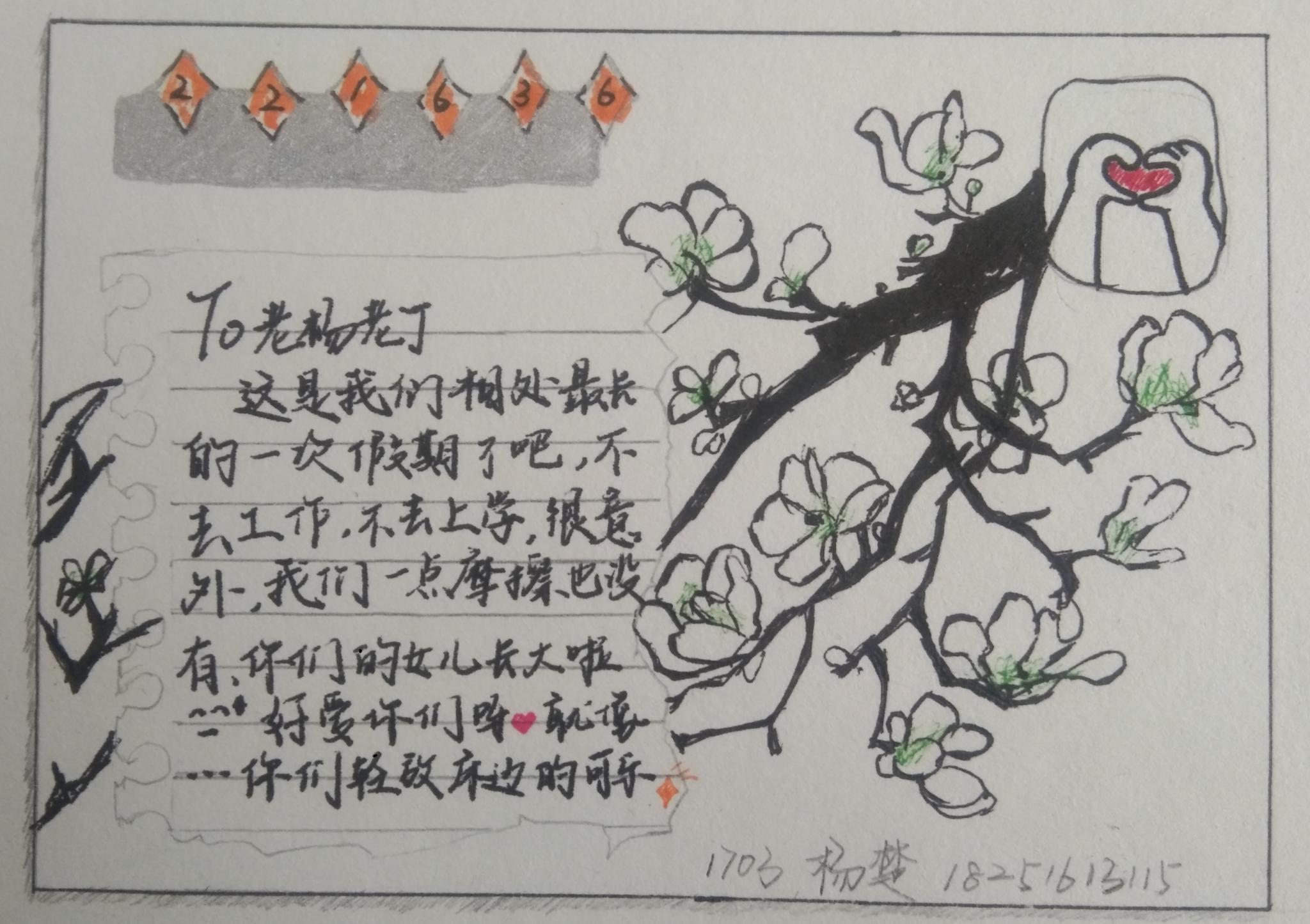 家和万事兴。一个美好幸福的家庭,不是管出来的,而是大家互相理解、体谅和爱出来的。在最长的寒假里,1703班的杨楚同学每日陪伴在父母身边,彼此体谅和理解着对方,没有争吵,温馨的度过每一天。