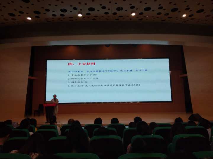 大会对实习时间安排、实习任务、纪律要求、上交材料、成绩评定等五个方面进行详细部署。实习从秋学期九月初开始,为期12周,三百余名小教学子根据自己的专业方向被安排往不同实习学校。为确保实习工作的深度落实,任红娟对实习提出五项任务:一、了解实习学校工作,观摩教学和班级管理等活动;二、认真对待教学工作;三、分清并学习班主任与少先队工作;四、关注教育调查;五、参与教育科研。对于教学工作,她尤为重视,提出认真备课、任教课时不少于15节、上交精品专业教案不少于6篇、听课记录不少于12篇、做好评教记录、谨慎批改作业和辅导等严格要求。严抓不懈的纪律问题在大会中仍被重点提及,任要求实习生服从实习单位规章制度、遵守课堂规则、小组成员互听互评密切合作、注意师仪师表、严格履行请假手续,尤其要注意安全。良好的学风与教科学子的风貌应该保持到实习单位中去,延续到未来的职业生涯中。会议最后,任对实习结束后所需上交材料进行详细解读。