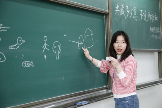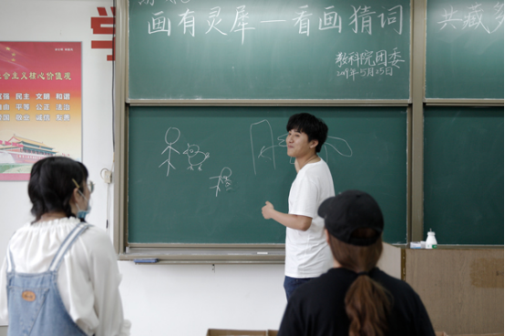 你划我猜和看画猜词的游戏教室格外热闹。大家自由组队,有的配合默契,两三个动作对方很快就猜出答案;有的队友配合就稍显生涩,不知如何表达,只能和搭档大眼瞪小眼。伴随着刺激和紧张,所有人都在游戏中投入自我,全力以赴,享受游戏带来的快乐。