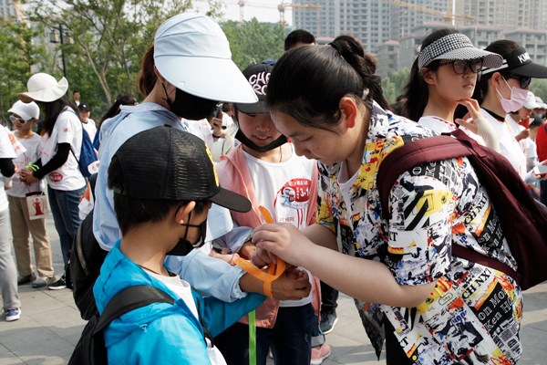 活动用丝带将孩子和家长系在一起,共同完成一个徒步五公里的任务。每完成一公里志愿者都会为小朋友贴上代表“完成一公里”的小爱心,并且给步行途中的母子们拍照纪念,帮他们留下最美好的瞬间。