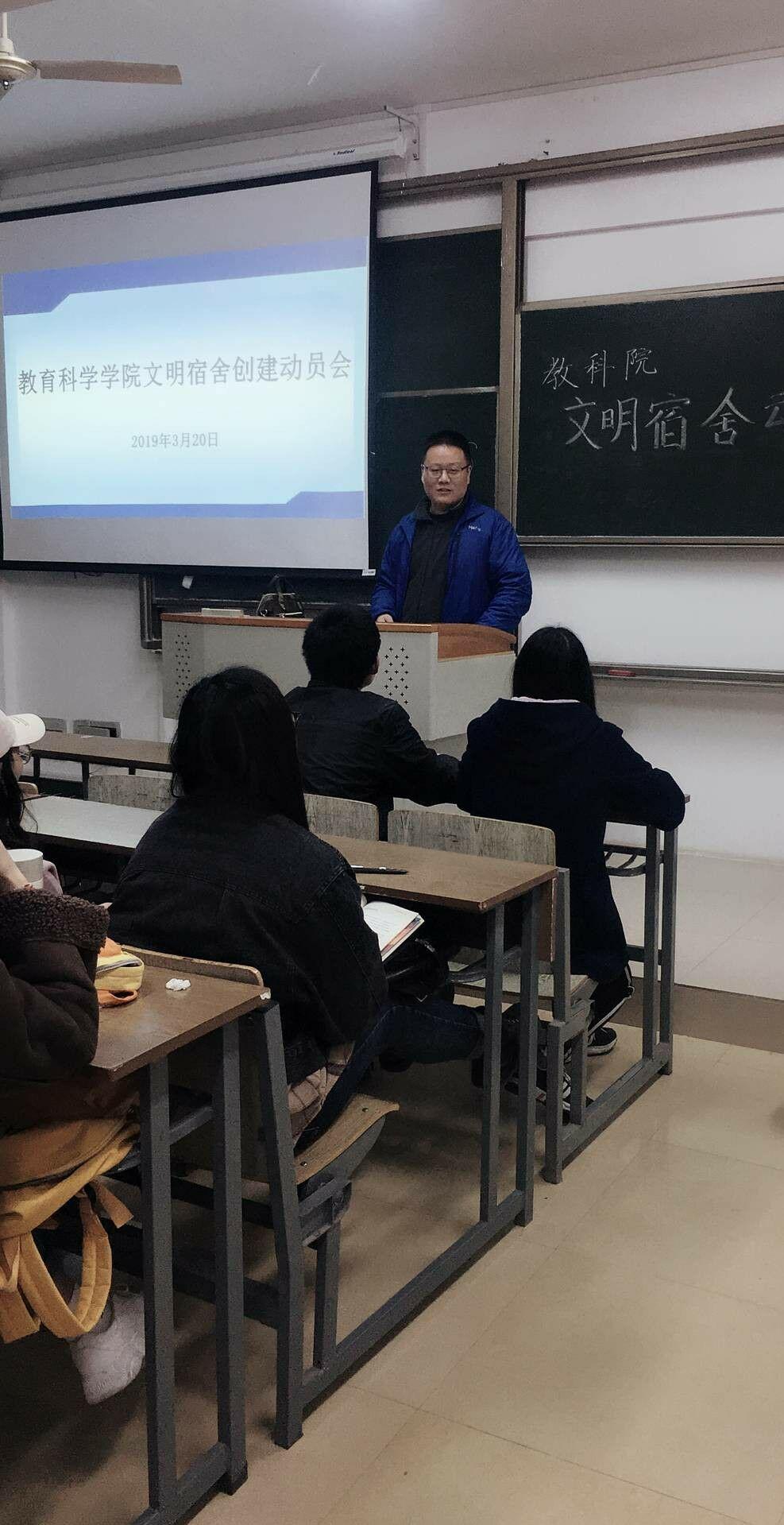 教科网3月21日电(记者 陈萌)大学生寝室是大学校园文化的窗口,是在校大学生最为紧密,交流最频繁的场所之一,寝室的好与坏直接反映在校大学生的成长情况。为进一步推进寝室文明建设,优化学习生活环境,3月20日,教育科学学院在崇文楼召开文明宿舍创建动员大会。16级、17级、18级全体班委及相关学生干部参加了此次会议。此次会议由学工办副主任陈萌老师主持。