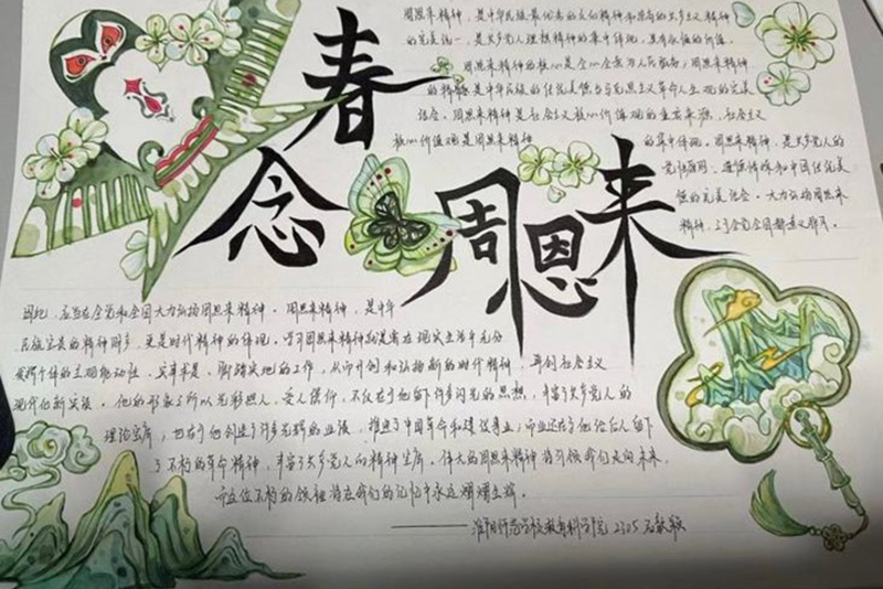 学生层面,学院紧密结合师范教育特色,发起了手抄报设计与非遗剪刻纸创作等活动。活动要求学生在作品中融入周恩来形象、名言或事迹元素,以此传承与发扬周恩来总理的高尚风范与道德情操。全院学生踊跃参与,创作了大批融合周总理生平事迹与教育理念的艺术作品,其中《海棠寄思》等剪纸作品尤为瞩目,创作者运用传统剪纸技艺,再现了总理的外交风采。