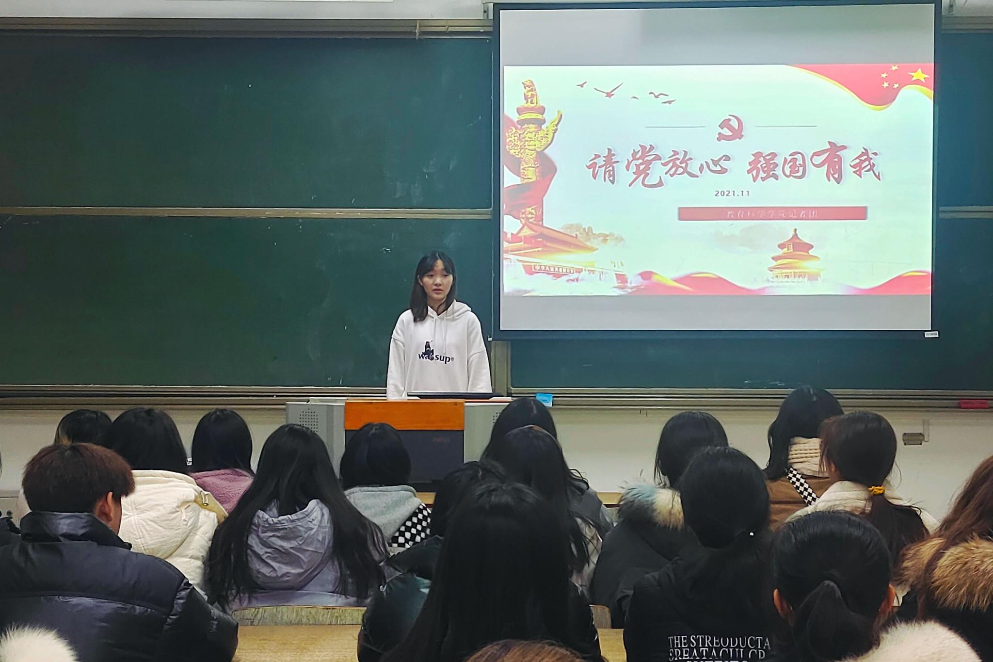 武美贤带领大家学习了习近平总书记的“七一”重要讲话精神,告知同学们要主动将精神贯彻到“信仰公开课”活动中,坚持不懈地以马克思主义中国化的最新成果来武装头脑。同时,积极推进团学实践工作及各项工作,如:“请党放心,强国有我”教育实践活动,“战‘疫’·实践·学习·成长”主题云分享活动等。她还引导同学们思考“大学生应该树立什么样的信仰”“新时代的青年能为国家做些什么?”等问题,又针对青年学生关注的社会、校园热点和成长话题进行讨论和交流,帮助学生在面对新形势、新情况、新问题时能够坚定政治立场,树立正确的世界观、人生观和价值观。最后,武美贤希望同学们能够学习党的十九届六中全会精神、“四史”学习教育内容,能做到铭记历史、学习强国,并将其贯彻到日常团委工作生活之中。