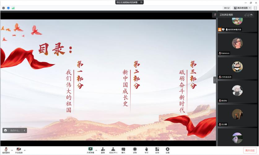 杨奕从“我们伟大的祖国”、“新中国成长史”、“砥砺奋斗新时代”三个部分,带领同学们回顾党史,学深悟透党的二十大精神,厚植理论根基,鼓励大家在新时代伟大事业的奋斗中成为可堪大用、能担重任的栋梁之材。