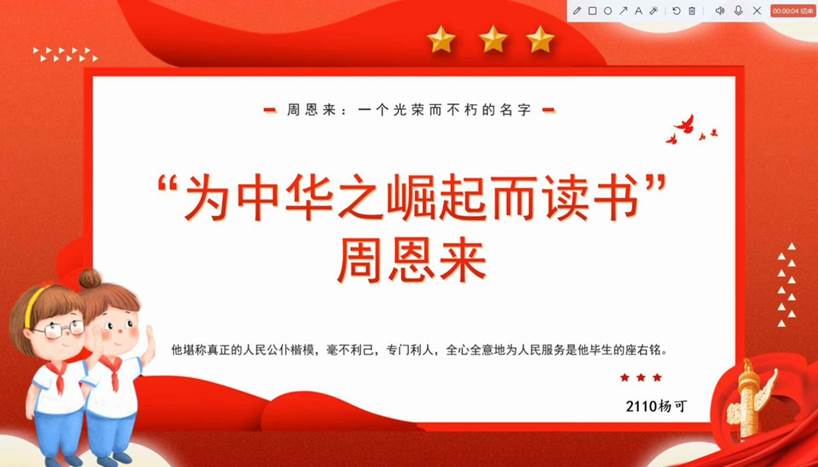 本次活动由三个部分组成。第一部分是“以诵传情”,该部分要求同学们借助网络、书籍等搜集关于周总理的资料并制作成PPT进行分享然后拍成视频。进行分享的同学要求口齿清晰、声情并茂、PPT精美,言语间饱含对周总理深深的爱戴之情。