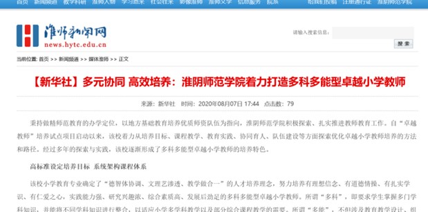 近年来,有40余所省内外高校先后专程考察学习我校小教专业建设工作。国内小学教育著名专家王智秋、马云鹏、惠中等对我校小教专业人才培养模式、办学成绩均给予充分肯定,认为我校已形成明显的办学优势。2016年《中国教育报》以“弄潮儿向涛头立 手把红旗旗不湿——royal皇家88平台小学教育专业建设纪实”为题(见图4),2020年新华社以“多元协同 高效培养:royal皇家88平台着力打造多科多能型卓越小学教师”为题(见图5),长篇报道了我校小教专业建设的经验和成效。