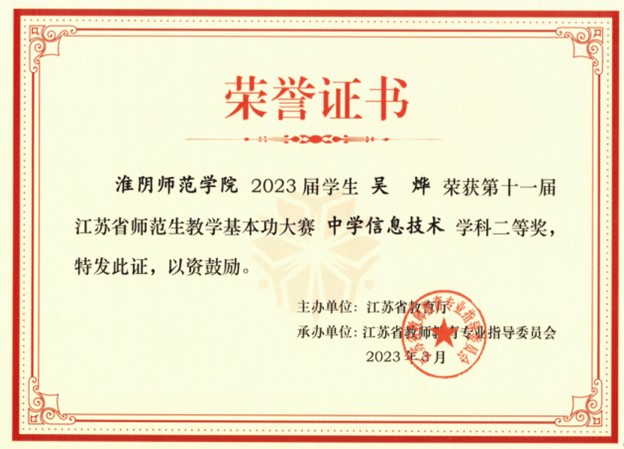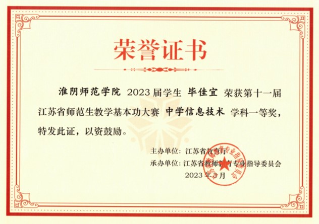 人才培养的特色定位使师范生具备扎实的专业素养与多元化能力。专业学生积极参与信息技术相关的竞赛,近四年,近百人次在领航杯、计算机设计大赛等省级以上学科竞赛中奖项,尤其在中国大学生计算机设计竞赛中表现突出,近五年获得一等奖一次,二等奖六次,三等奖六次的好成绩。在近三年的省师范生教学基本功大赛(信息技术学科)中获得一等奖2项,二、三等奖4项,获奖率及一等奖人数始终位居全省同类高校前列。
