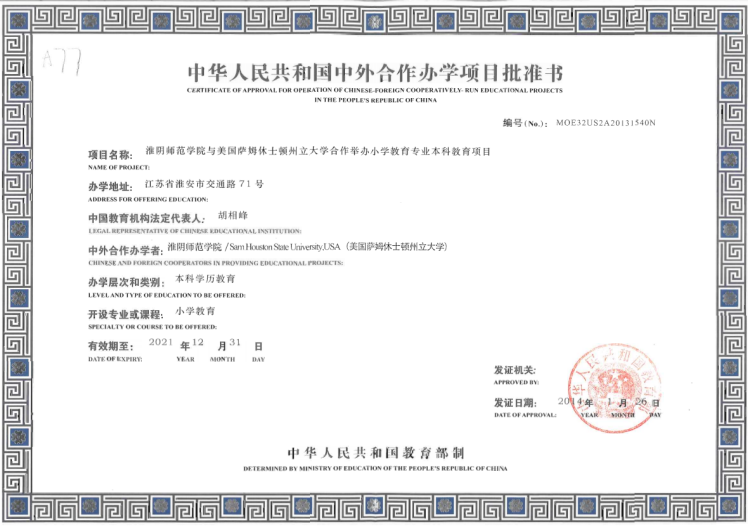 royal皇家88平台与美国萨姆休斯顿州立大学(Sam Houston State University)合作举办小学教育专业本科教育项目于2014年获得教育部批准备案,并于同年招生。本项目采用“3+1”(具体为“2+1+1”)的人才培养模式,即通过英语考试的学生第一、第二、第四学年在我校学习,第三学年到美国萨姆休斯顿州立大学教育学院学习。