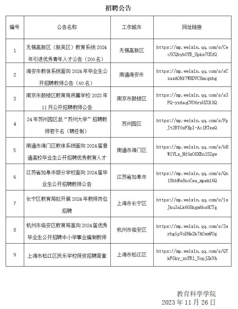 教育科学学院2023-2024学年第一学期第14周招聘信息