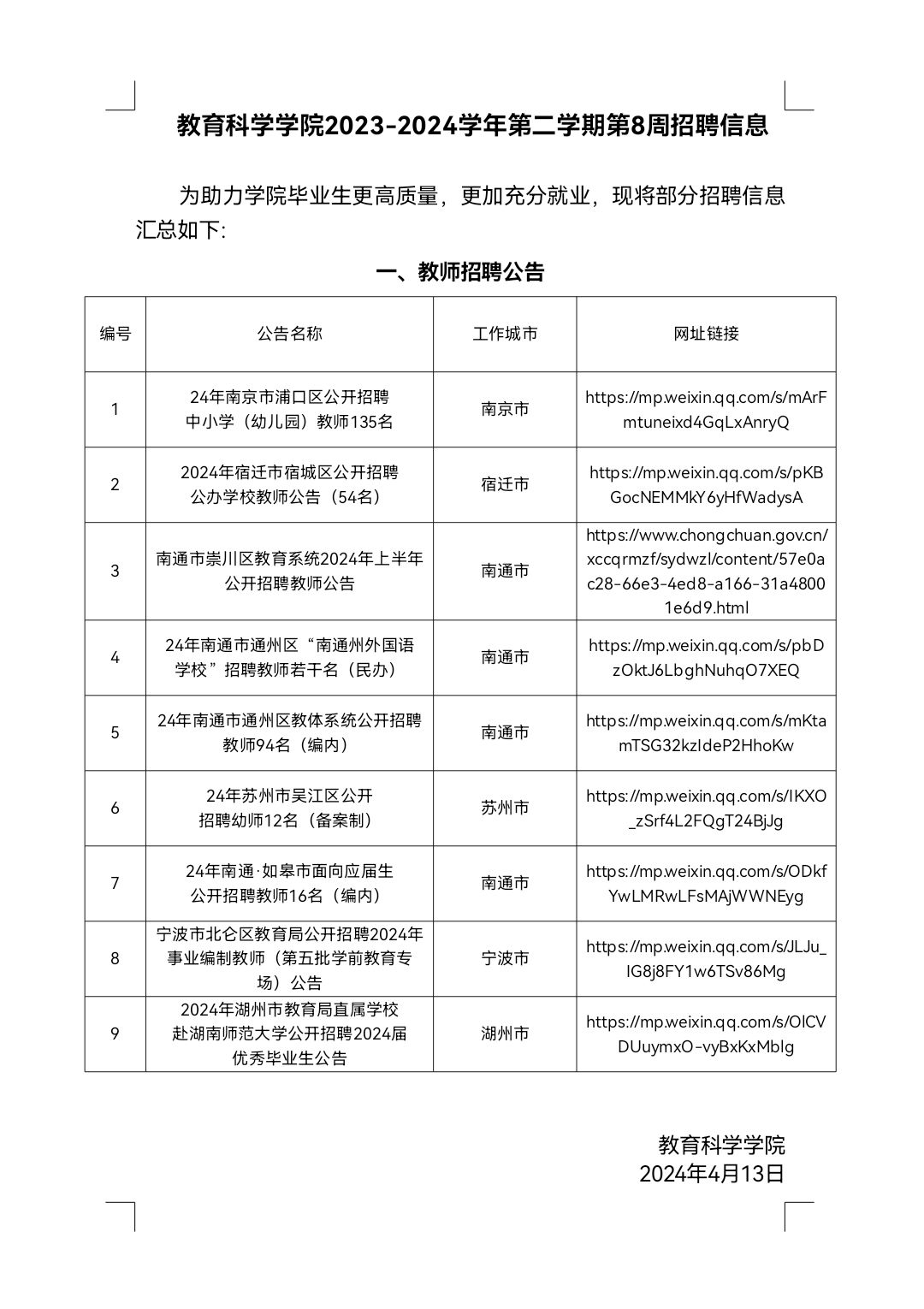 教育科学学院2023-2024学年第二学期第8周招聘信息
