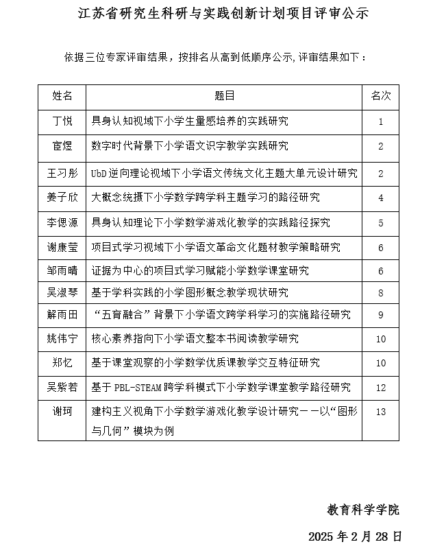 江苏省研究生科研与实践创新计划项目评审公示