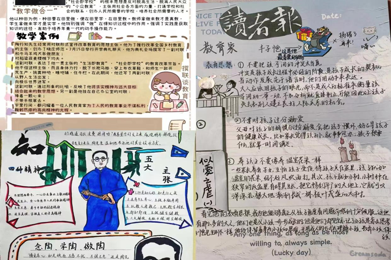 图示作品中介绍了陶行知的“知”“行”与四精神五主张、教学合一理念,丰子恺的教育思想