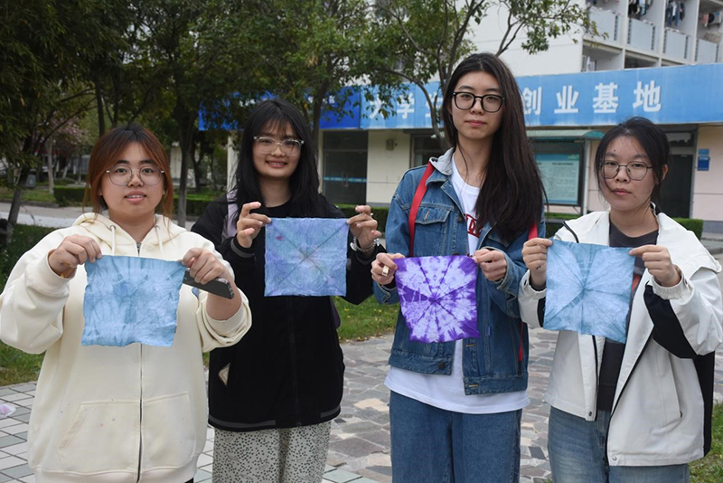 本次活动的开展,迎来了很多对扎染感兴趣的淮师学子,他们通过负责人的讲解,融入了自己的新意,随着实践呈现了各具特色的作品。本次活动的深意与价值也在这些扎染布品中浮现。“非遗云裳,