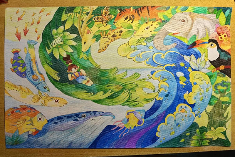 在活动期间内,同学们带着对自然环境的热爱与保护地球环境的信念,围绕主题背景“世界地球日”开展了创作,将大自然的美好与如何保护环境相融合,创作出了一幅幅精美的作品。