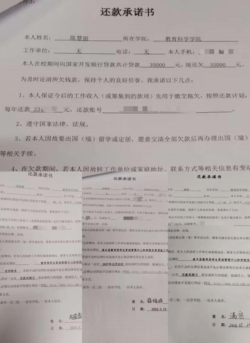 图为部分同学的还款承诺书。记者 方蕊 摄