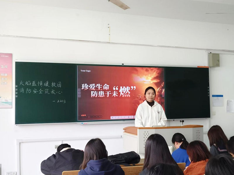 2203班团支书郭紫馨同学详细讲解火灾发生的原因、分类以及预防措施。随后通过观看消防相关教学视频,同学们了解了各种消防器材的使用技巧和火灾逃生的正确方法。团支书通过互动问答环节,使同学们学到了正确拨打火警电话的步骤以及火灾现场安全撤离的宝贵知识。经过此次活动,同学们深刻认识到火灾的危害性和预防的重要性,并熟练掌握了应对火灾的基本技能,还进一步提升了同学们对消防员的崇敬之情。