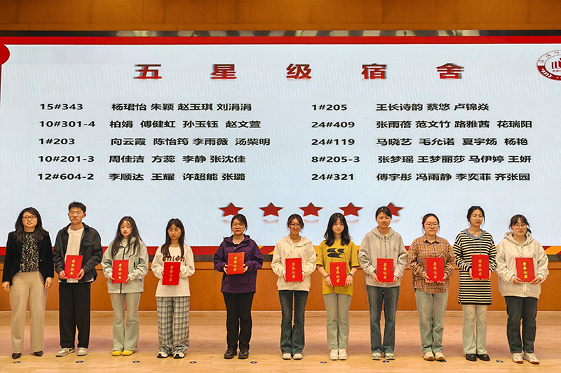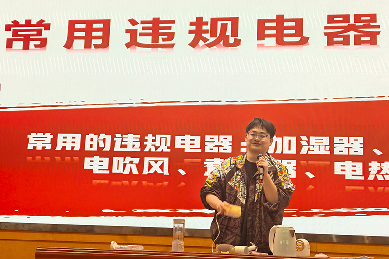 最“美”宿舍舍长傅健虹、学霸宿舍长田莹、最“和谐”宿舍舍长路雅茜三位同学分别从宿舍卫生、学习氛围营造、舍友关系维护等方面分享了他们的经验与心得,为学院全面推进宿舍文化建设提供了宝贵的经验。黄羽、蒋振晔等五位同学带来了精彩的情景剧《我们的宿舍生活》,她们以贴近生活的场景,生动呈现了宿舍生活中常见的卫生问题和人际交往问题,在一片欢声笑语中引导同学们思考如何正确处理宿舍关系,增强了同学们的自我反思和解决问题的能力。万博文同学以幽默风趣的脱口秀形式,生动展示了宿舍中常见的违规电器,在轻松的氛围中认知违规电器的风险,强化守牢安全底线的意识。会上,还通过视频片方式对宿舍卫生、安全隐患进行了警示教育。