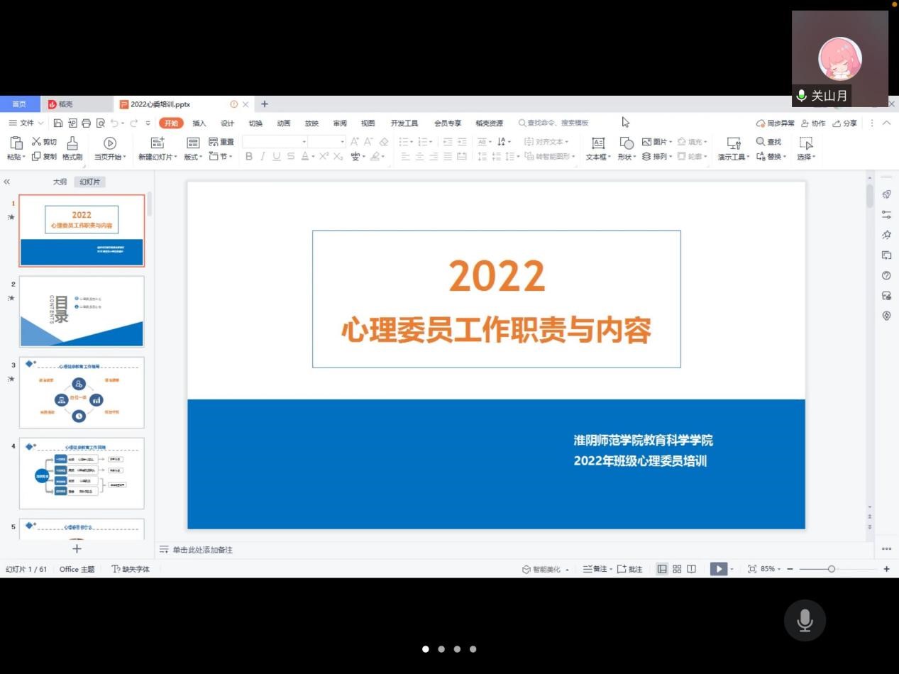 教科网4月18日电(记者 陈葛钰 叶文萱)为加强疫情防控封闭管理期间的心理服务工作,引导大学生树立“珍爱生命、心向阳光、砥砺前行、共创未来”的理念,学院于4月17日晚19:00召开线上心理委员培训会。本次会议由教科院心理健康部负责人关山月主讲,教科院19-21级心理委员和心理健康部部分成员共38人参会。