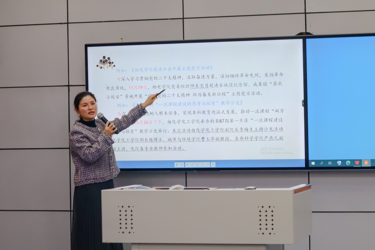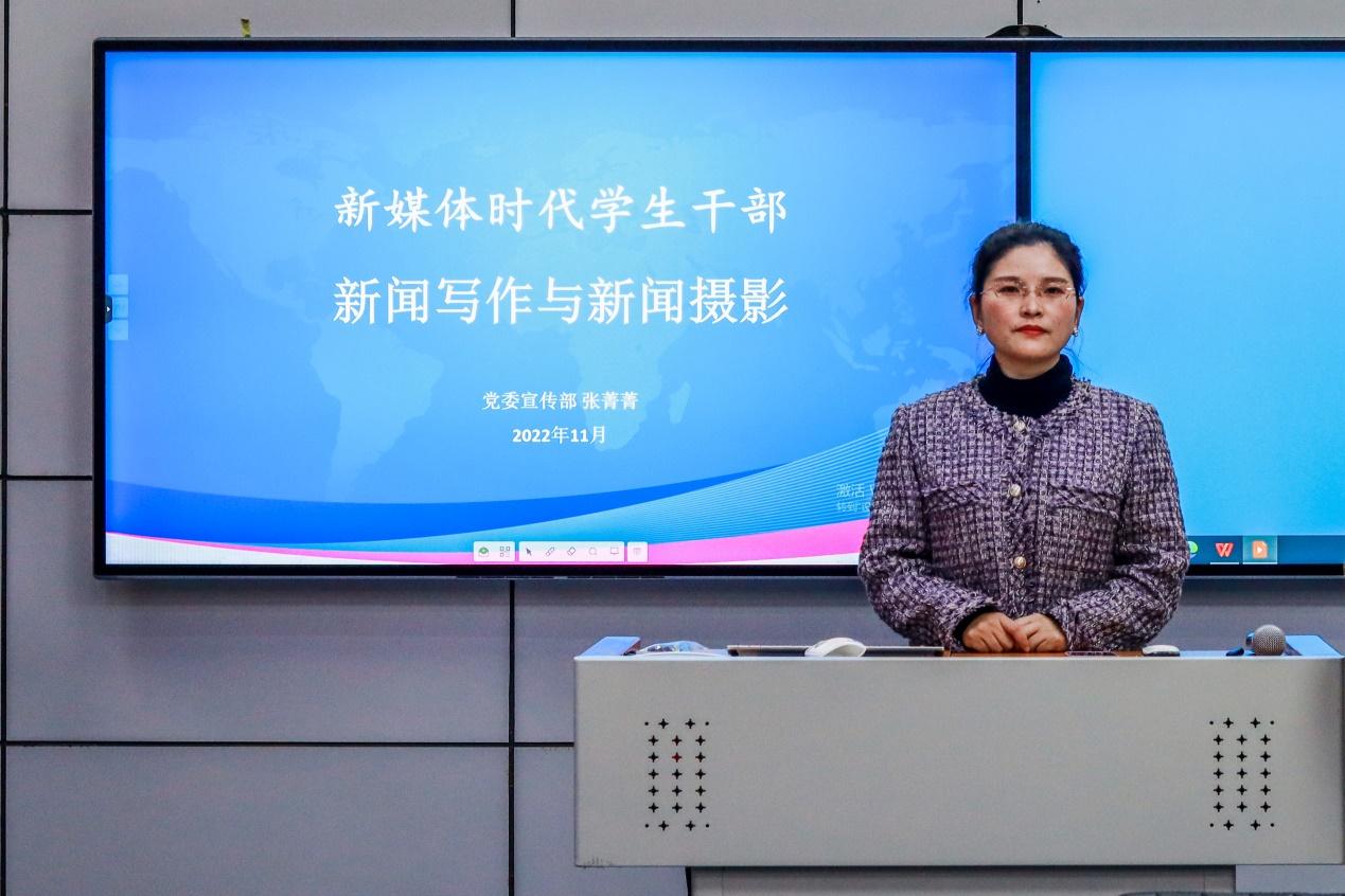 张菁菁以“新媒体时代学生干部新闻写作与新闻摄影”为题,从为什么学习新闻写作、什么是新闻、如何写新闻、如何拍好新闻照片四个方面深入浅出地为大家解读了新闻写作与摄影的要点和难点,讲解过程中她还展示了学校主页上很多优秀新闻作品,通过案例教学对新闻稿撰写过程中易出现的标题不规范、逻辑不清晰、重点不突出、图片不符合规范等问题进行针对性指导。