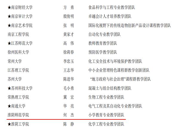教科网6月15日电(记者 潘架丹近日,江苏省教育厅公布了2019年江苏高校“青蓝工程”培养对象名单,共入选优秀青年骨干教师350人,中青年学术带头人160人,优秀教学团队70个。淮阴师范教育科学学院副院长何杰教授带领的小学教育专业教学团队入选2019年省高校“青蓝工程”优秀教学团队。
