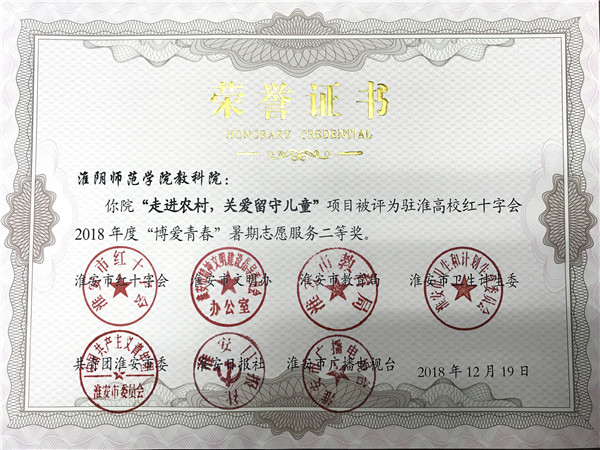 图为教科院获2018年驻淮高校“博爱青春”暑期志愿服务项目二等奖。