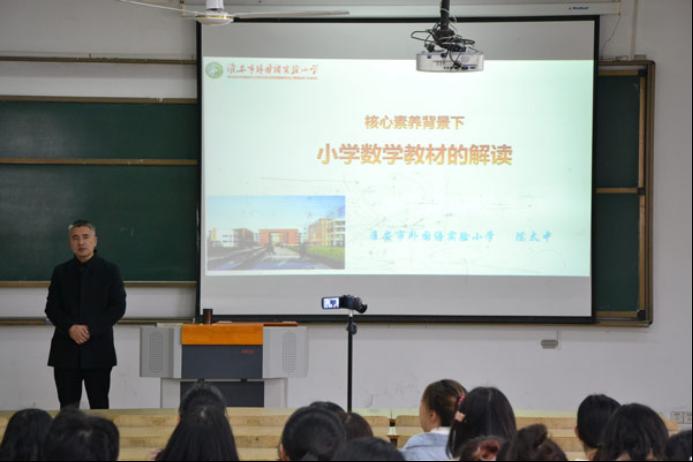 教科网11月19日电(记者 周宇晗 肖妍梅)为了让2018级小学教育专业的学生对小学数学教材有更加深刻的了解,11月18日下午,royal皇家88平台教育科学学院于崇文楼阶梯教室204开展“核心素养背景下小学数学教材解读”讲座。本次讲座由淮安市数学学科带头人陈太中主讲,教科院2018级小教专业部分学生参加了此次讲座。