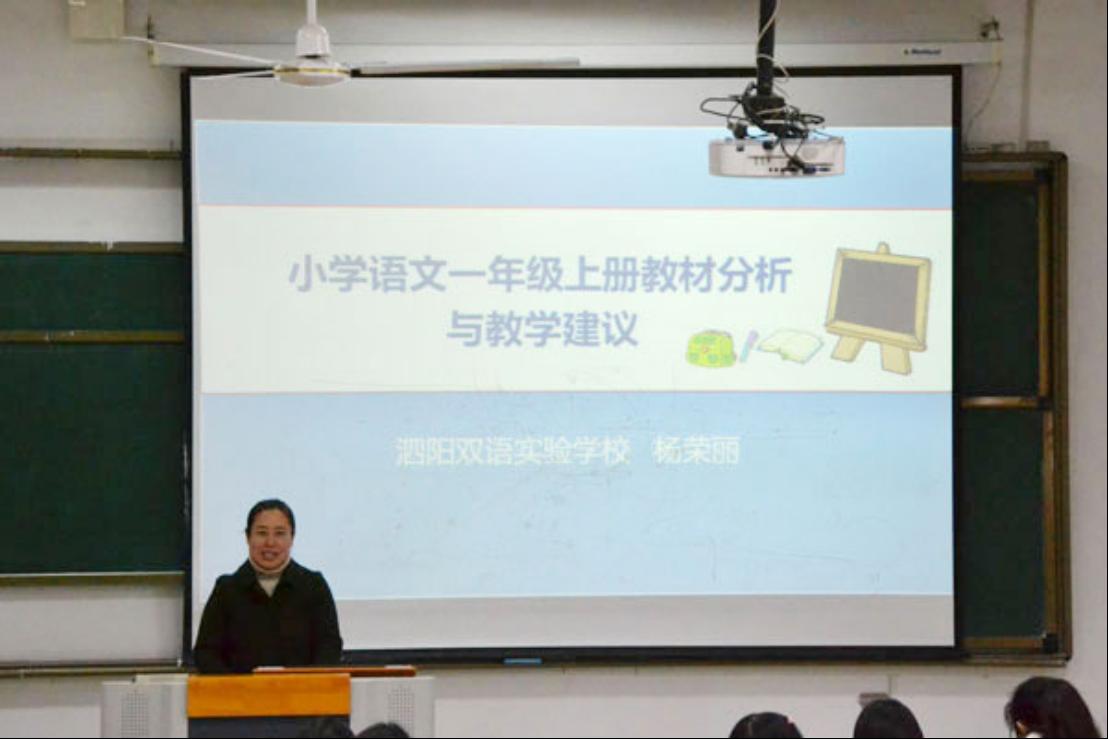 教科网11月26日电 (记者 胡梦园 王志文 为了让小学教育专业的学生对小学教材有更多的了解11月25日下午,royal皇家88平台教育科学学院邀请泗阳双语实验学校教科室主任杨荣丽于崇文楼阶梯教室204开展题为“小学语文一年级上册教材分析与教学建议”的专题讲座。本次讲座由教科院副院长任红娟主持,教科院部分师范生参加。
