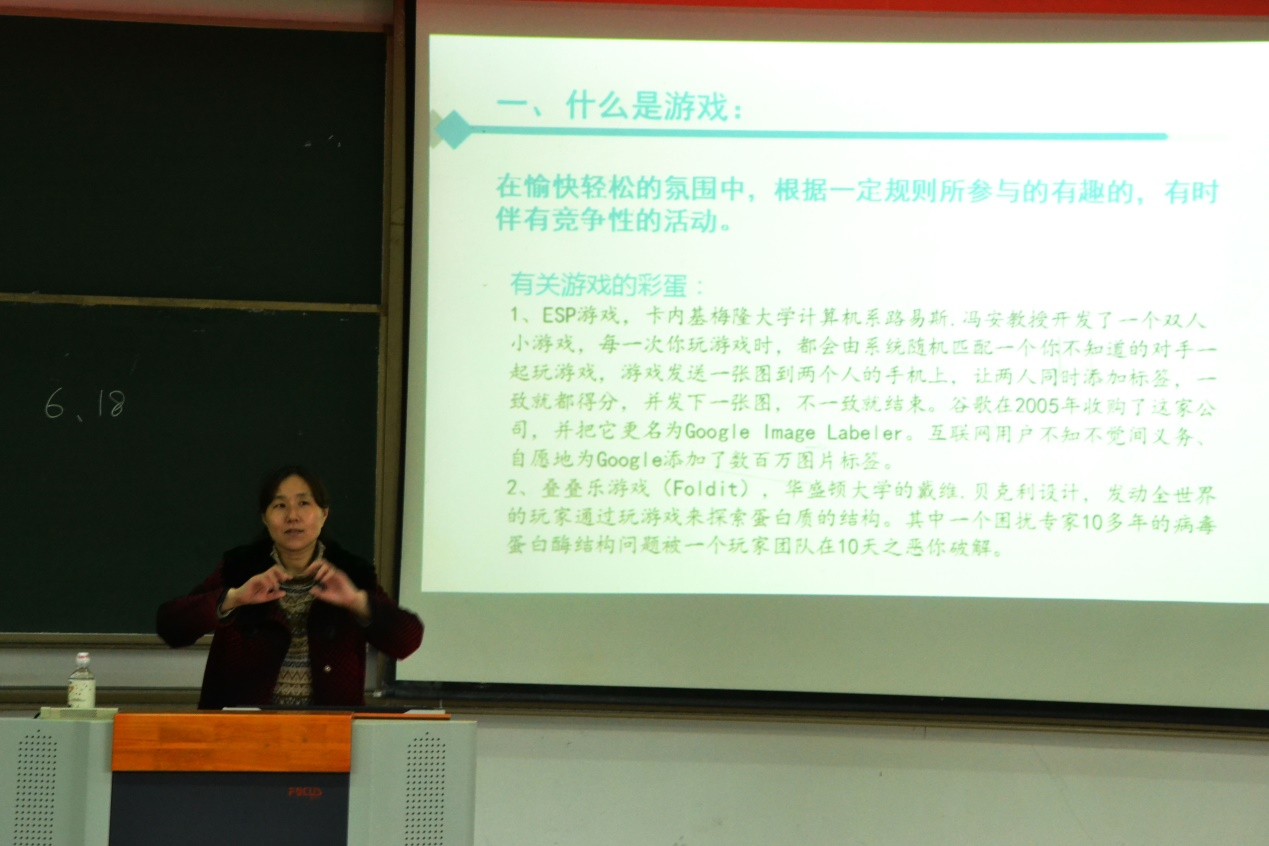 讲座伊始,谢诺通过与同学们玩了个小游戏引出游戏的定义。她指出将游戏或游戏元素、理念或设计用到教学中,能更好地调动同学参与学习的积极性。在教学中,学生的参与度至关重要,作为老师,应该设法营造一个愉快轻松的学习氛围,并且增加与学生的互动,这样才能吸引同学们的兴趣,使课堂不至于枯燥乏味。最后谢诺通过数制及其转换和可能性的游戏案例,再次强调将游戏应用于教学活动中或将教学活动设计成游戏的重要性。