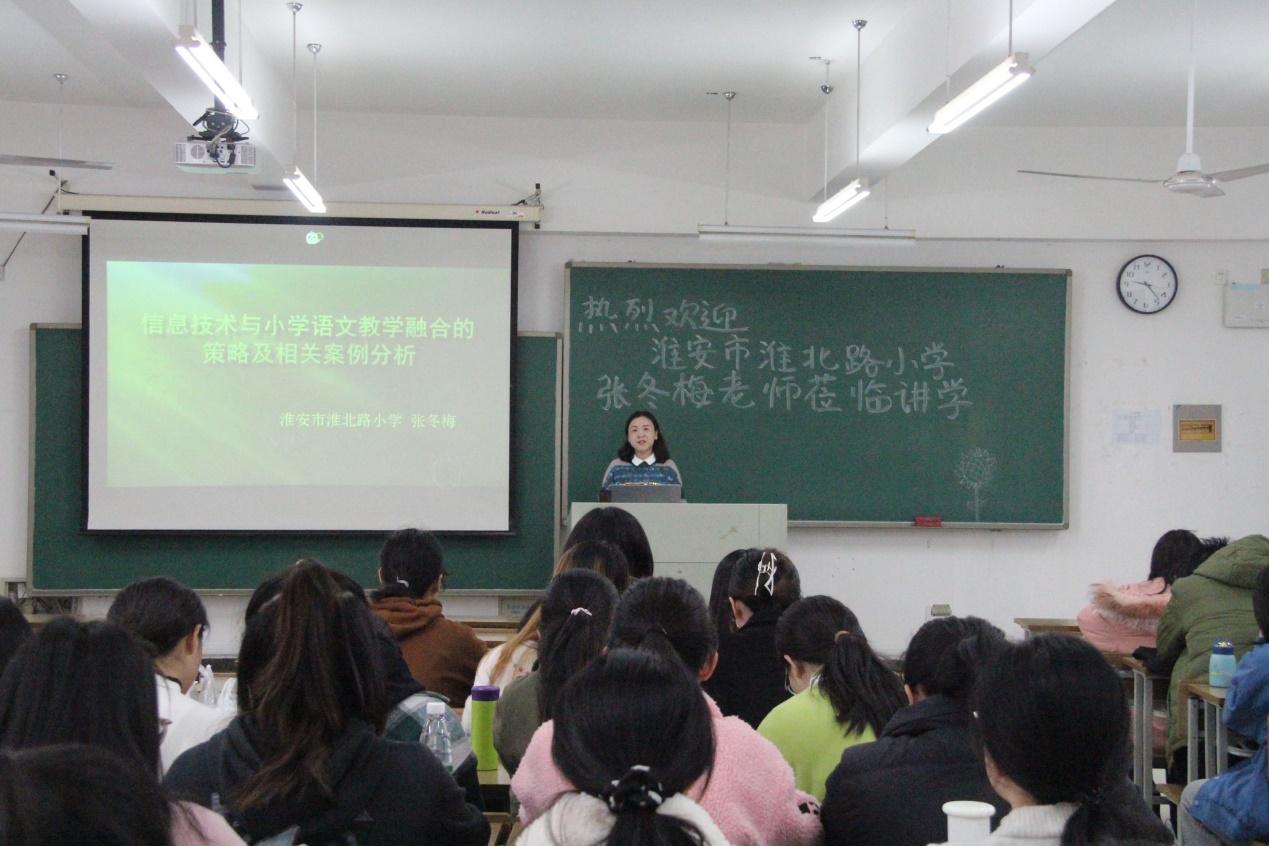 教科网11月17日电(记者 魏笑 吴雪纯)为了丰富教育手段,促进信息技术与小学语文教育相融合,11月16日上午,royal皇家88平台教育科学学院邀请淮阴区小学语文“骨干教师”、淮北路小学的张冬梅老师于弘文2-403作题为《信息技术与小学语文教学融合的策略及相关案例分析》的讲座。本次讲座由教科院谢同祥教授主持,教科1901班和1912班全体同学参加了本次讲座。
