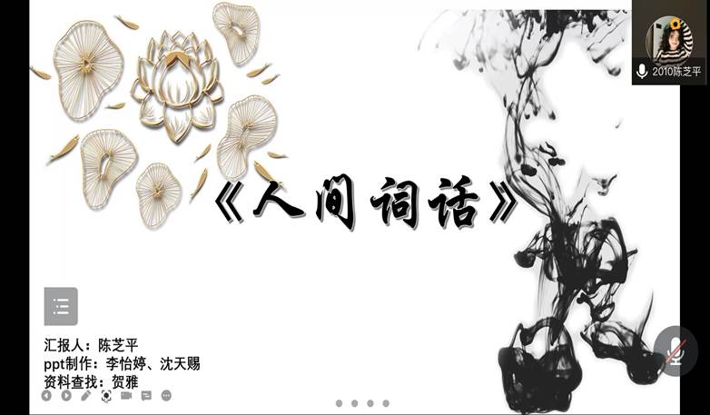首先由陈芝平小组分享书目《人间词话》的阅读收获,主要从作者简介、书籍概况、境界说、相关摘录和后世影响等五个方面展开。《人间词话》是王国维接受了西洋美学思想之洗礼后,以崭新的眼光对中国旧文学所作的评论。它具备理论体系,在近现代词论界影响深远,具有哲学意义和人生指导意义,值得阅读。